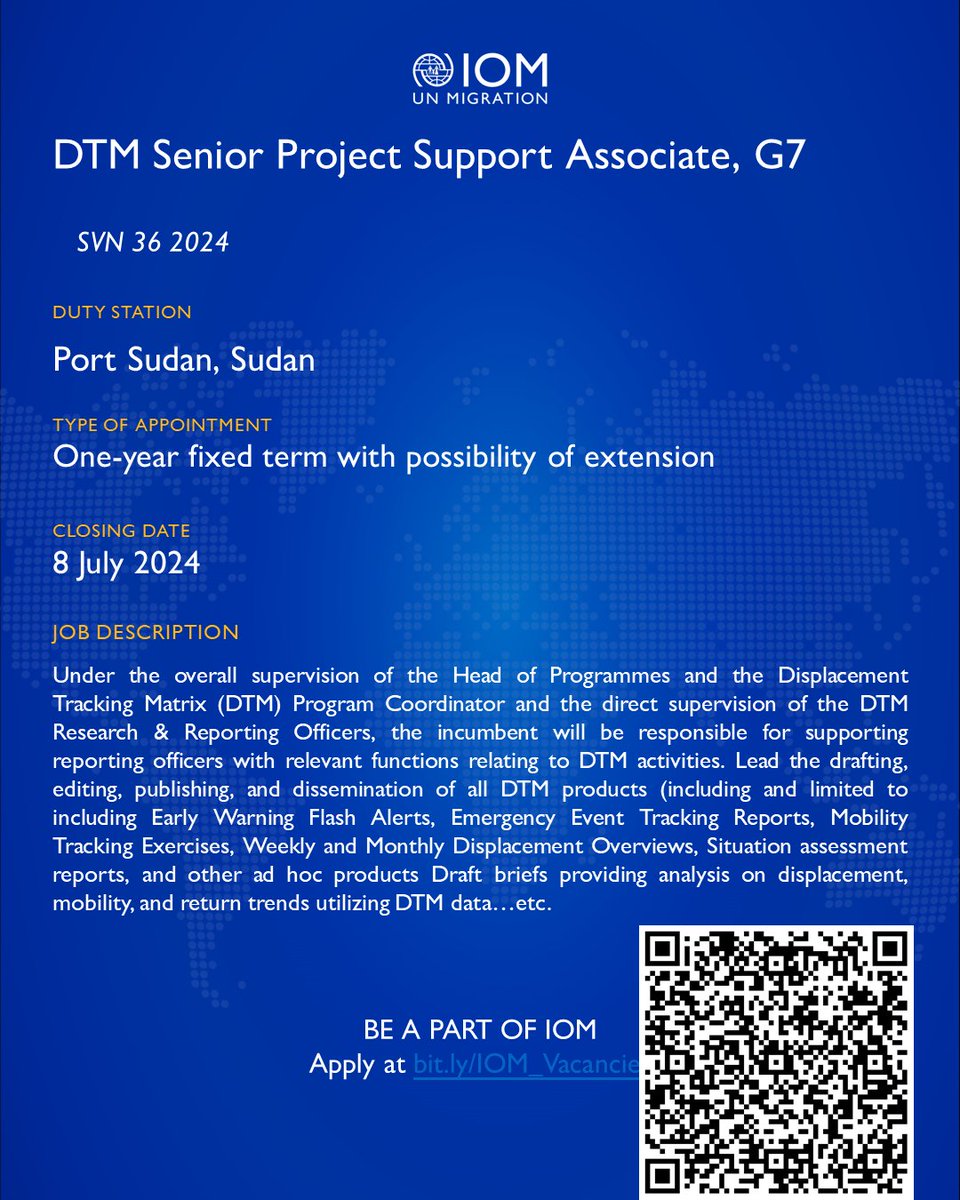 IOM is looking for a DTM Senior Project Support Associate, G7, in Port Sudan, Sudan.