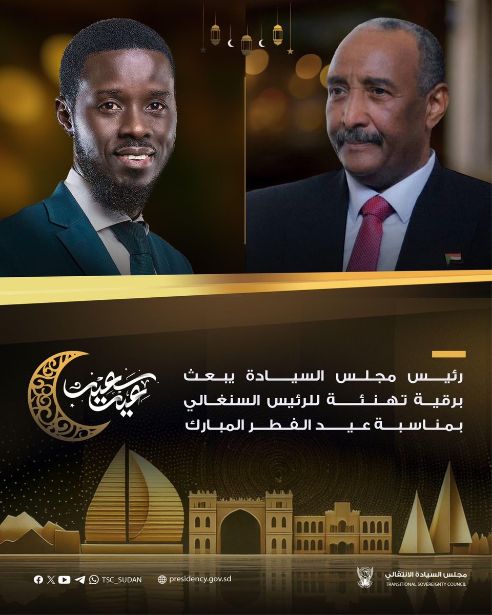 ⭕️ رئيس مجلس السيادة الانتقالي الفريق أول الركن #عبدالفتاح_البرهان يبعث برقية تهنئة لرئيس جمهورية السنغال صاحب الفخامة #باسيرو_ديوماي_فاي ، بمناسبة عيد الفطر المبارك .