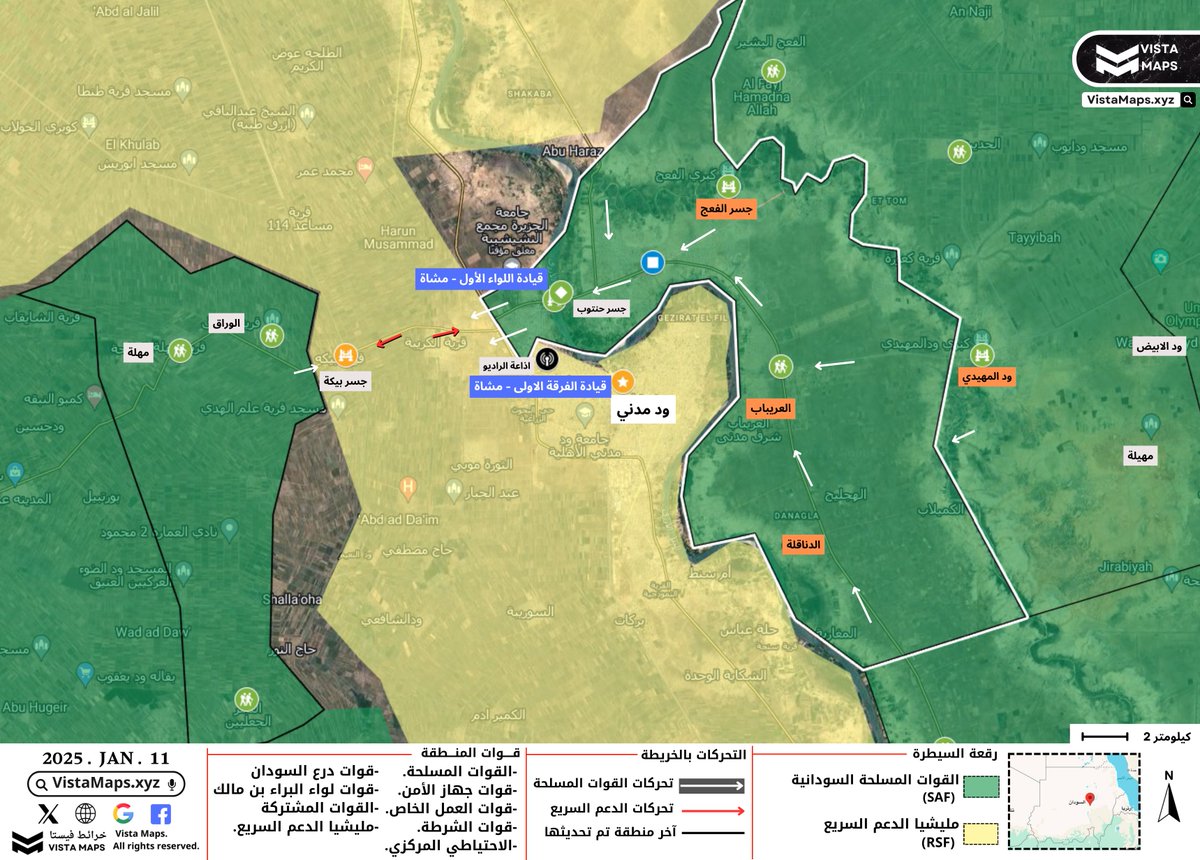 – سيطرة القوات المسلحة على قيادة اللواء الأول وجسر حنتوب ومنطقة شرق ود مدني بالكامل.