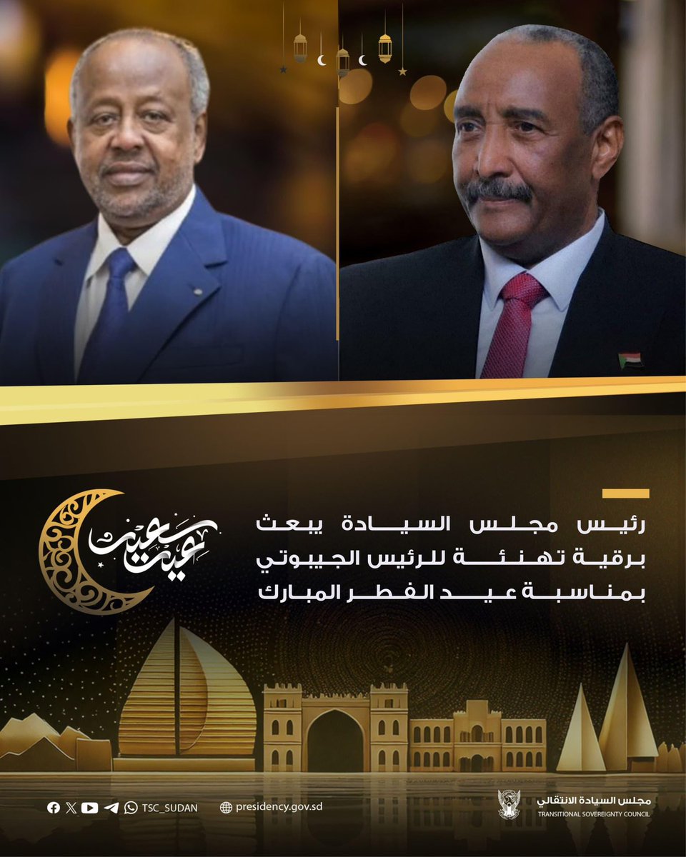 ⭕️ رئيس مجلس السيادة الانتقالي الفريق أول الركن #عبدالفتاح_البرهان يبعث برقية تهنئة لرئيس جمهورية جيبوتي صاحب الفخامة #إسماعيل_عمر_جيلة ، بمناسبة عيد الفطر المبارك .