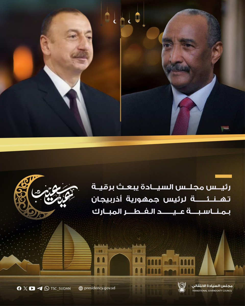 ⭕️ رئيس مجلس السيادة الانتقالي الفريق أول الركن #عبدالفتاح_البرهان يبعث برقية تهنئة لرئيس جمهورية أذربيجان صاحب الفخامة #إلهام_علييف ، بمناسبة عيد الفطر المبارك .