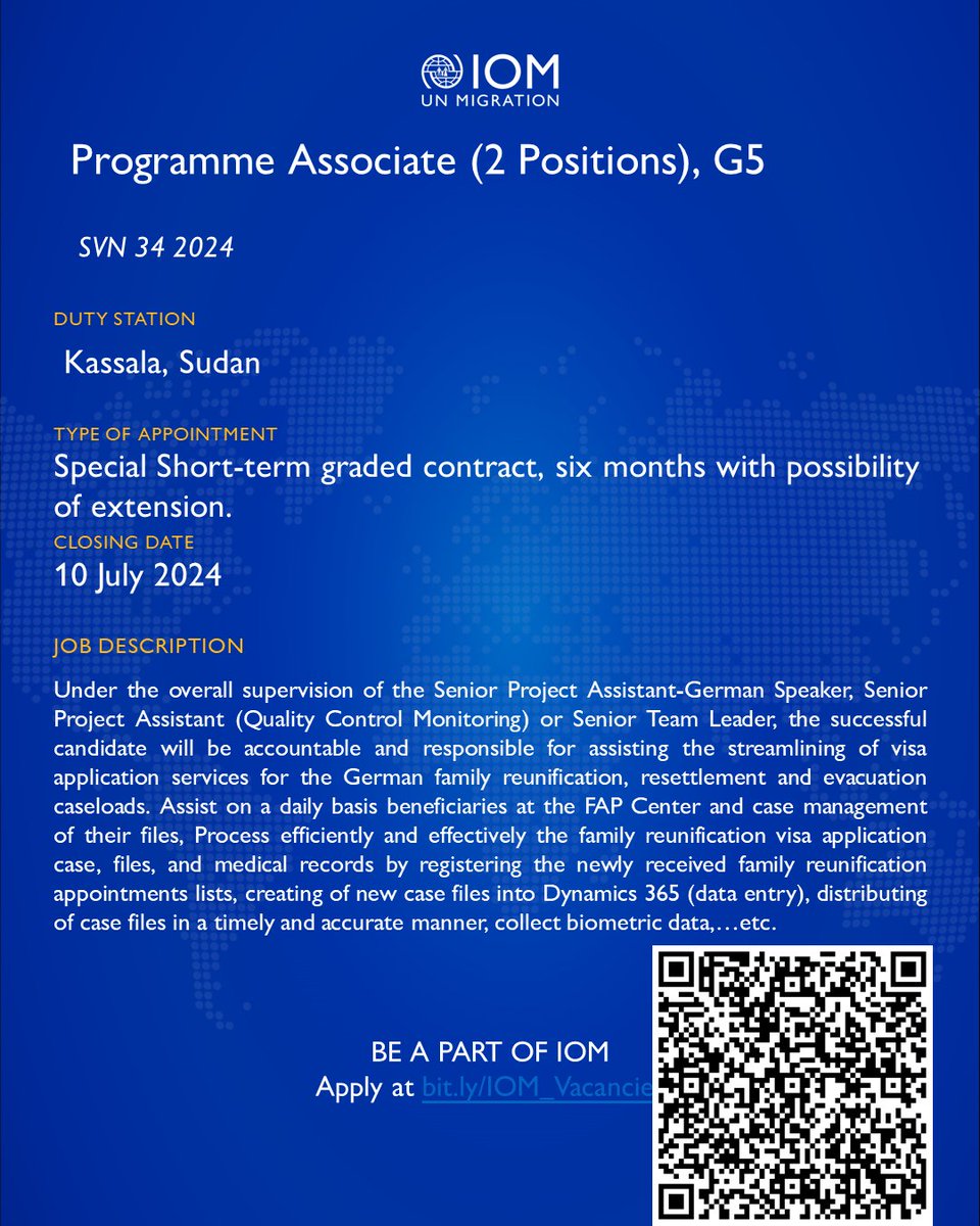 IOM is looking for a Programme Associate (2 Positions), G5, in Kassala, Sudan.