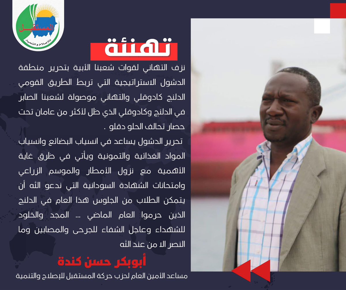 تحرير الدشول يساعد في انسياب البضائع وانسياب المواد الغذائية والتمونية ويأتي في ظرق غاية الأهمية مع نزول الأمطار والموسم الزراعي وامتحانات الشهادة السودانية التي ندعو الله أن يتمكن الطلاب من الجلوس هذا العام في الدلنج الذين حرموا العام الماضي … المجد والخلود للشهداء وعاجل الشفاء للجرحى والمصابين وما النصر الا من عند الله
