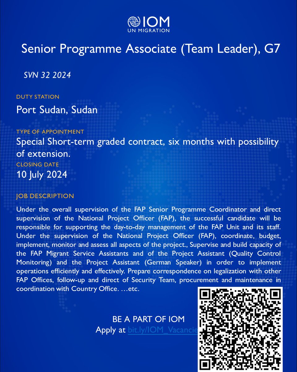 IOM is looking for a Senior Programme Associate (Team Leader), G7, in Port Sudan, Sudan.