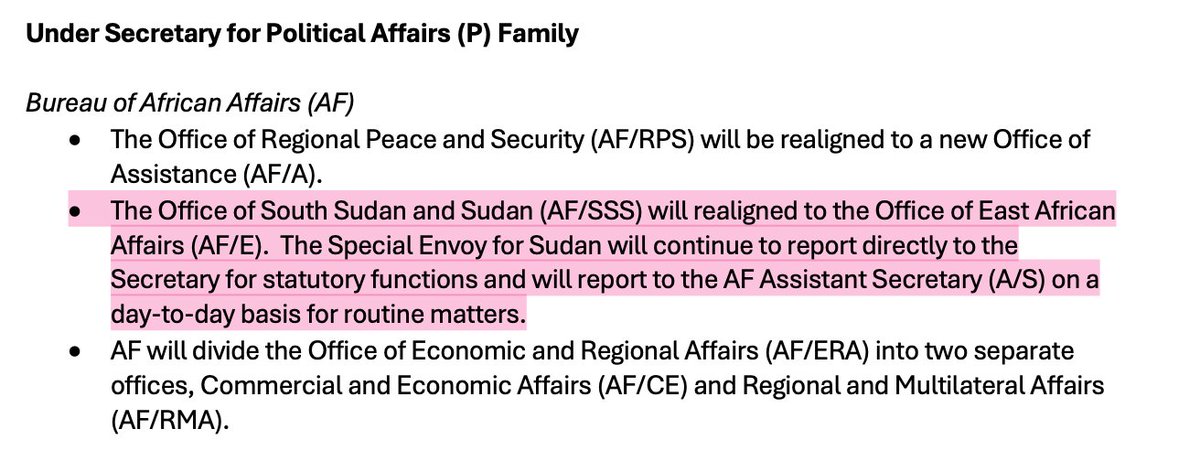 Interesting to note in the just announced State Department re-organization, that the office of Sudan/South Sudan being folded into the East Africa office, but acknowledges the presence of an as-yet unnamed Special Envoy for Sudan answering to @SecRubio.