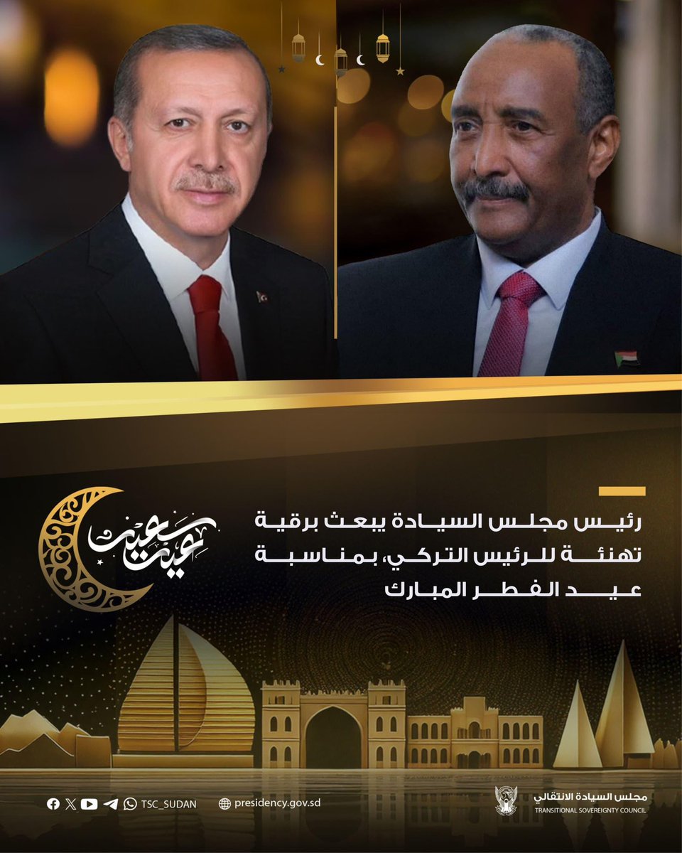 ⭕️ رئيس مجلس السيادة الانتقالي الفريق أول الركن #عبدالفتاح_البرهان يبعث برقية تهنئة لرئيس جمهورية تركيا صاحب الفخامة #رجب_طيب_أردوغان، بمناسبة عيد الفطر المبارك .
