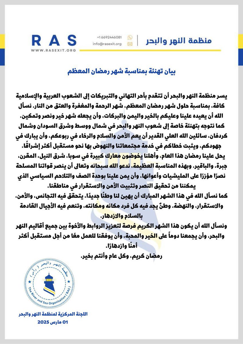ونسأل الله أن يكون هذا الشهر الكريم فرصة لتعزيز الروابط والأخوة بين جميع أقاليم النهر والبحر، وأن يجمعنا دوماً على الخير والمحبة، وأن يوفقنا للعمل معًا من أجل مستقبل أكثر أمنًا وازدهارًا.