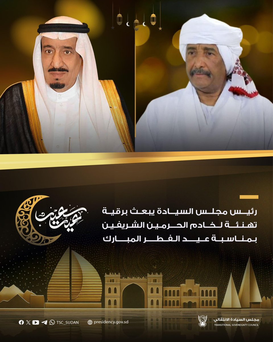 ⭕️ رئيس مجلس السيادة الانتقالي الفريق أول الركن #عبدالفتاح_البرهان يبعث برقية تهنئة لخادم الحرمين الشريفين صاحب الجلالة. الملك #سلمان_بن_عبدالعزيز_آل_سعود بمناسبة عيد الفطر المبارك .
