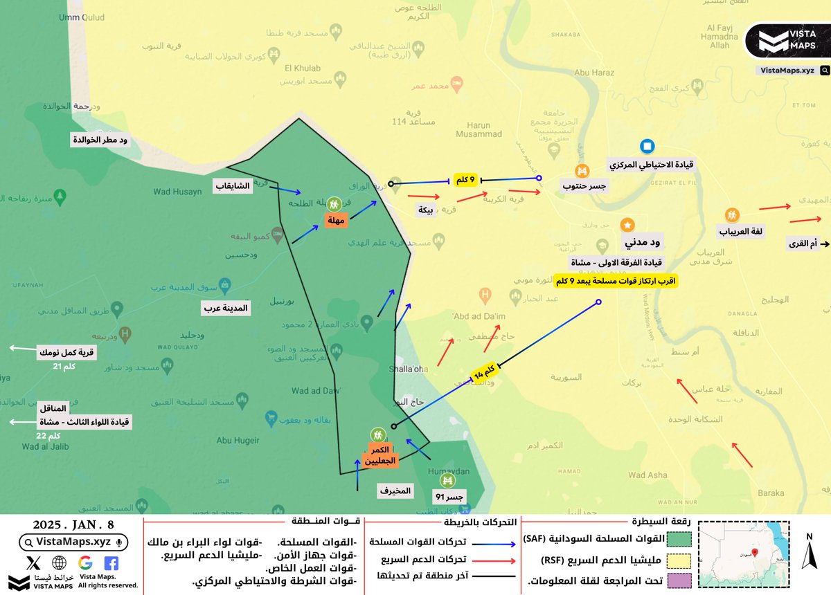 – القوات المسلحة بقيادة اللواء الثالث تسيطر على منطقتي الكمر الجعليين ومهلة، مقلصةً المسافة بينها وبين ود مدني إلى 9 كيلومترات.