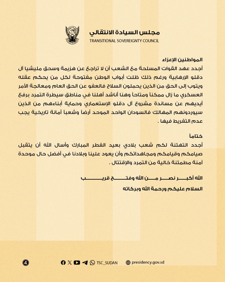 مجلس السيادة رئيس مجلس السيادة يوجه كلمة للشعب السوداني بمناسبة عيد الفطر المبارك بورتسودان… By null Published September 13, 2025 Share SHARE Facebook Twitter Pinterest LinkedIn[ad_1] ⭕️ رئيس مجلس السيادة يوجه كلمة للشعب السوداني بمناسبة عيد الفطر المبارك بورتسودان ٢٩-٣-٢٠٢٥م [ad_2] Source by مجلس السيادة الإنتقالي – السودان Facebook Twitter Pinterest LinkedIn Share This Article Facebook Twitter Email Print Previous Article He also stressed that they will provide support to succeed in conducting this ye… Next Article الآن .. البث المباشر اليومي. … Leave a Comment Leave a Reply Cancel replyYour email address will not be published. Required fields are marked *Comment * Name * Email * Website Save my name, email, and website in this browser for the next time I comment. Δ SearchSearchRecent Postsأكرمنا الله صباح اليوم الأحد بلقاء إخوةٍ كرام، على ضفة النيل الأزرق، حيث شاي الش… أعلن بنك السودان المركزي في منشور إدارة السياسات رقم (2025/15) رفع الاحتكار عن ا… ندوة بعنوان: القانون الدولي والسيادة الوطنية قراءة في موقف السودان من لجنة تقصي … والي نهر النيل تستقبل وزير الموارد البشرية والرعاية الاجتماعية الوزير يشيد بالأ… كامل ادريس: رئيس اللجنة السياسية لمؤسسات الدولة السودانية. Recent CommentsNo comments to show.