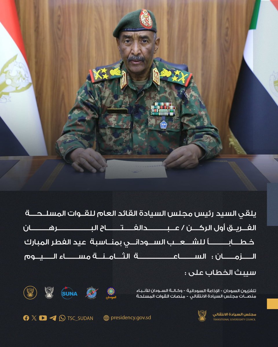 ⭕ يلقي السيد رئيس مجلس السيادة القائد العام للقوات المسلحة الفريق أول الركن / #عبدالفتاح_البرهان خطاباً للشعب السوداني بمناسبة عيد الفطر المبارك