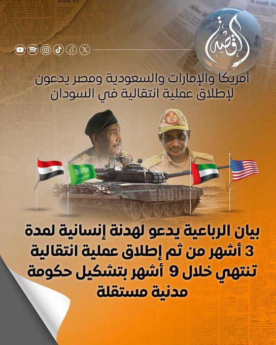 وفي بيان الرباعية أيضاً اشارة واضحة للجماعة الارهابية التي اشعلت الحرب وقطعت الطريق على استقرار السودان للعودة الى السلطة وان محاولتها السيطرة الكاملة على السودان مرفوضة .