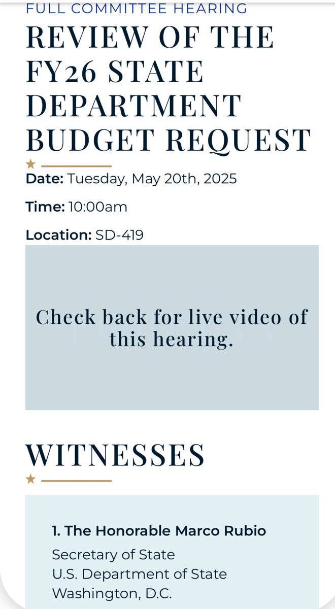 📌 جلسة استماع لوزير الخارجية ماركو روبيو حول موازنة الوزارة امام لجنة العلاقات الخارجية في الشيوخ