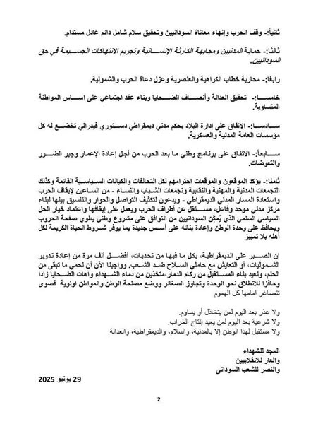 8. العمل المشترك والتنسيق بين كل التجمعات المدنية والمهنية والشبابية والنسوية لاستعادة المسار الديمقراطي، وبناء مركز مدني موحد، مستقل عن أطراف الحرب، يقود مشروعاً وطنياً سلمياً ينهي الحرب ويضمن وحدة السودان والعدالة والكرامة لكل مواطن.