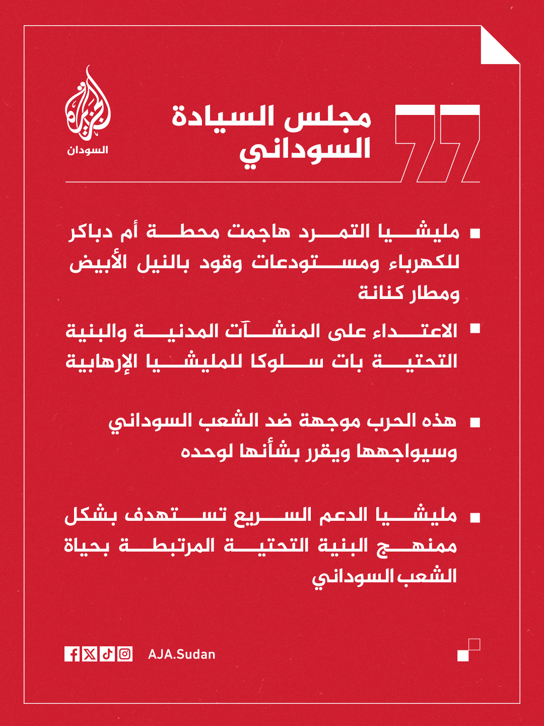 عاجل | مجلس السيادة السوداني: مليشيا التمرد هاجمت محطة أم دباكر للكهرباء ومستودعات وقود بالنيل الأبيض ومطار كنانة