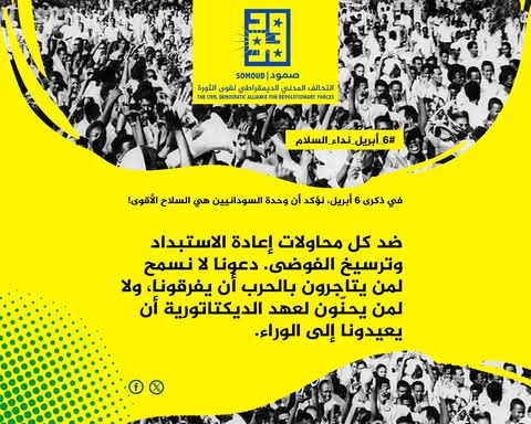 ولكننا، في التحالف المدني الديمقراطي لقوى الثورة – صمود، نؤمن أن جذوة الثورة لم ولن تنطفئ، وأن روح 6 أبريل ما زالت تسري في شوارع بلادنا، وفي قلوب بناتها وأبنائها الذين يرفضون الاستسلام للحرب، والعودة إلى عهود الاستبداد والظلم، رغم محاولات النظام السابق لاختطاف حاضر السودان ومستقبله.