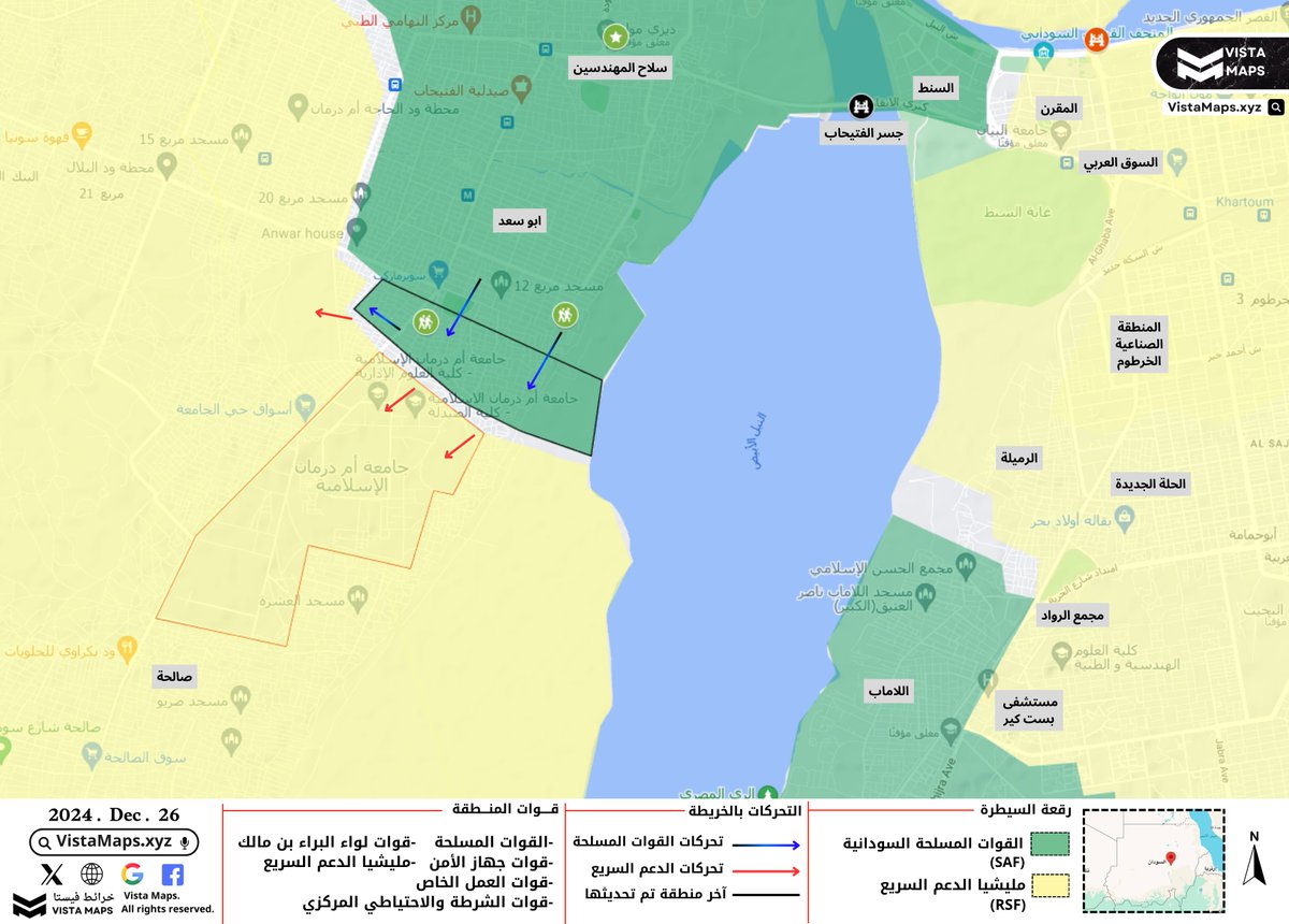 – القوات المسلحة تحرز تقدماً كبيراً في جنوب أمدرمان، حيث سيطرت على عدة مربعات سكنية مؤخراً ووسعت مناطق سيطرتها إلى بوابة جامعة أمدرمان الإسلامية.