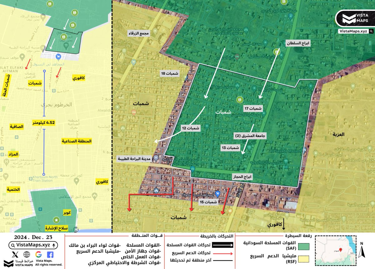 – تمكنت القوات المسلحة من السيطرة على أبراج الحجاز وجامعة المشرق والمربعات السكنية (17/13/12) بحي شمبات مع تقدم نحو مدينة البراحة الطبية.