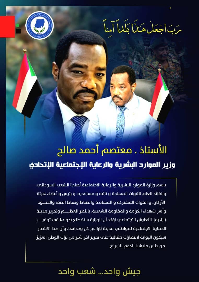 On behalf of the Ministry of Human Resources and Social Welfare, we congratulate the Sudanese people, the Commander-in-Chief of the Armed Forces, his deputy and assistants, the Chief of Staff and members of the staff, the Joint and Support Forces, officers, non-commissioned officers, and soldiers, as well as the families of the martyrs of dignity and popular resistance, on the great victory and the liberation of the city of Bara, a symbol of social coexistence.