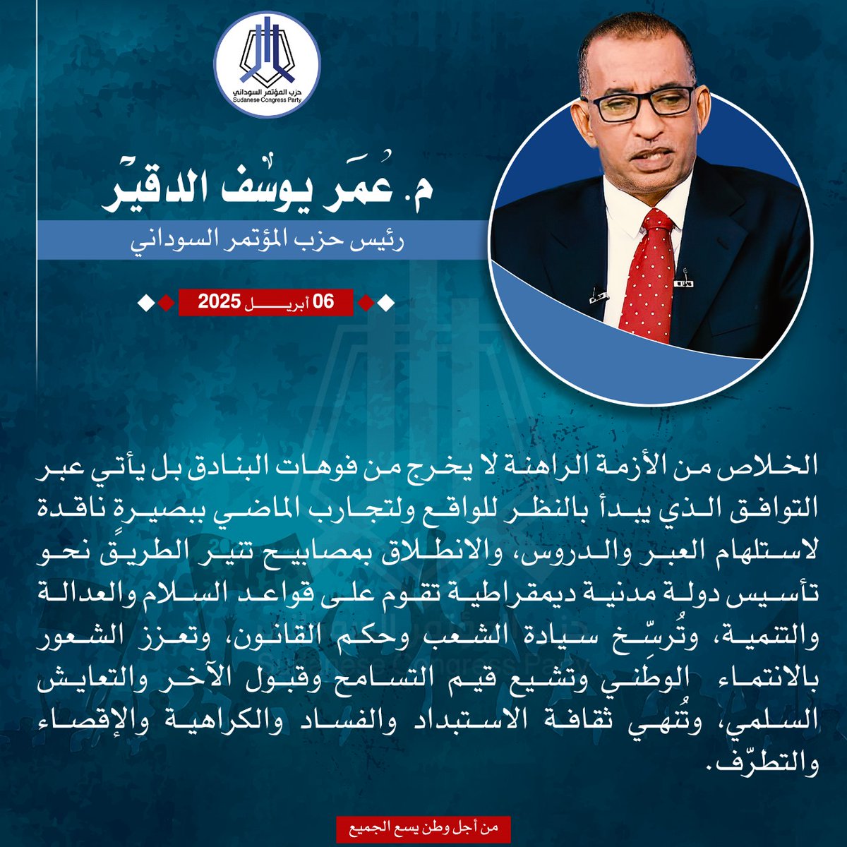 الخلاص من الأزمة الراهنة لا يخرج من فوهات البنادق بل يأتي عبر التوافق الذي يبدأ بالنظر للواقع ولتجارب الماضي ببصيرةٍ ناقدة لاستلهام العبر والدروس، والانطلاق بمصابيح تنير الطريق نحو تأسيس دولة مدنية ديمقراطية تقوم على قواعد السلام والعدالة والتنمية، وتُرسِّخ سيادة الشعب وحكم القانون، وتعزز الشعور بالانتماء الوطني وتشيع قيم التسامح وقبول الآخر والتعايش السلمي، وتُنهي ثقافة الاستبداد والفساد والكراهية والإقصاء والتطرّف.
