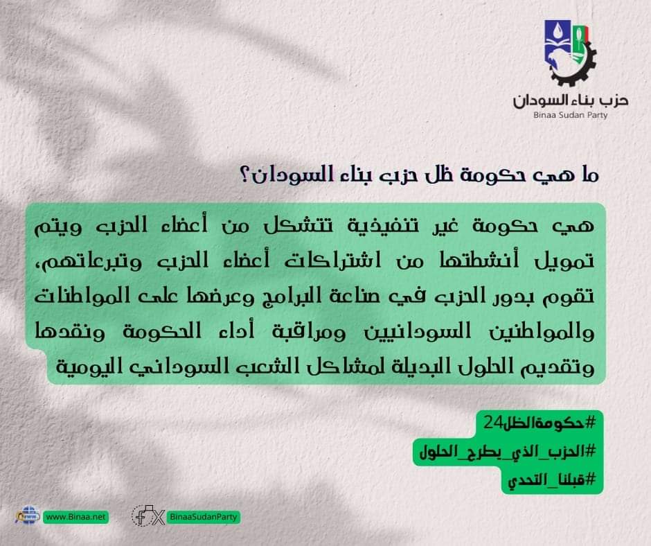 حزب بناء السودان ما هي حكومة ظل حزب بناء السودان؟ هي حكومة غير تنفيذية تتشكل من أعضاء الحزب ويتم… By null Published September 15, 2025 Share SHARE Facebook Twitter Pinterest LinkedIn[ad_1] ما هي حكومة ظل حزب بناء السودان؟ هي حكومة غير تنفيذية تتشكل من أعضاء الحزب ويتم تمويل أنشطتها من اشتراكات أعضاء الحزب وتبرعاتهم، [ad_2] Source by حزب بناء السودان Facebook Twitter Pinterest LinkedIn Share This Article Facebook Twitter Email Print Previous Article من عدد يناير 2023م بصحيفة طليعة لبنان الواحد … Next Article الإصرار على الاحتكام لمنطق القوة والغلبة في مواجهة الأزمات الوطنية لا يقود إلى ل… Leave a Comment Leave a Reply Cancel replyYour email address will not be published. Required fields are marked *Comment * Name * Email * Website Save my name, email, and website in this browser for the next time I comment. Δ SearchSearchRecent Postsأكرمنا الله صباح اليوم الأحد بلقاء إخوةٍ كرام، على ضفة النيل الأزرق، حيث شاي الش… أعلن بنك السودان المركزي في منشور إدارة السياسات رقم (2025/15) رفع الاحتكار عن ا… ندوة بعنوان: القانون الدولي والسيادة الوطنية قراءة في موقف السودان من لجنة تقصي … والي نهر النيل تستقبل وزير الموارد البشرية والرعاية الاجتماعية الوزير يشيد بالأ… كامل ادريس: رئيس اللجنة السياسية لمؤسسات الدولة السودانية. Recent CommentsNo comments to show.