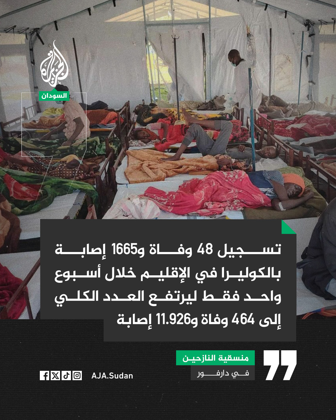 منسقية النازحين بدارفور: تسجيل 48 حالة وفاة و1665 إصابة بالكوليرا بالإقليم خلال أسبوع واحد فقط