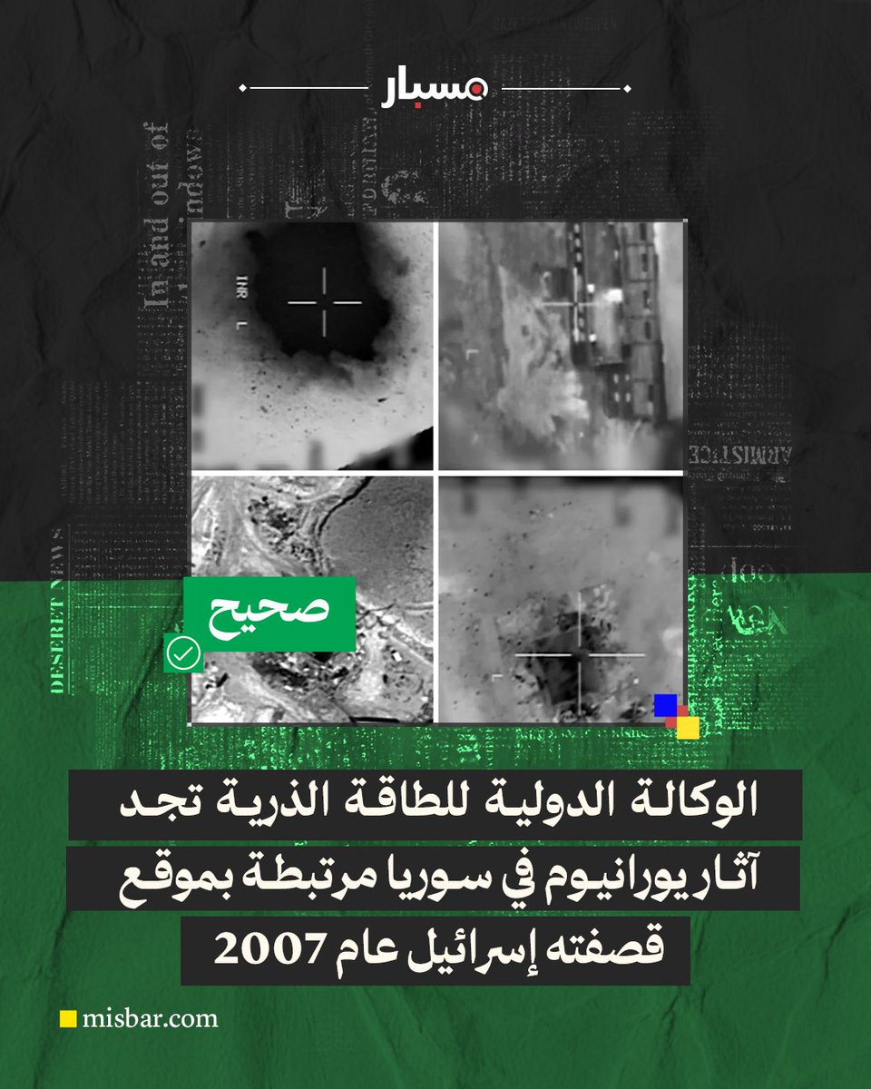 ✅ أعلنت الوكالة الدولية للطاقة الذرية، يوم أمس الإثنين، أنّها عثرت على آثار يورانيوم في موقع سوري دمّرته إسرائيل عام 2007، مرجحة أنه كان مفاعلًا نوويًا غير معلن، فيما قالت حكومة الرئيس السوري المخلوع بشار الأسد، حينها، إنه مجرد قاعدة عسكرية.
