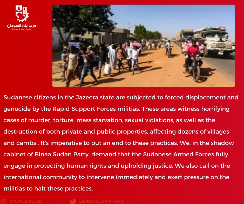 Sudanese citizens in the Jazeera state are subjected to forced displacement and genocide by the Rapid Support Forces militias.