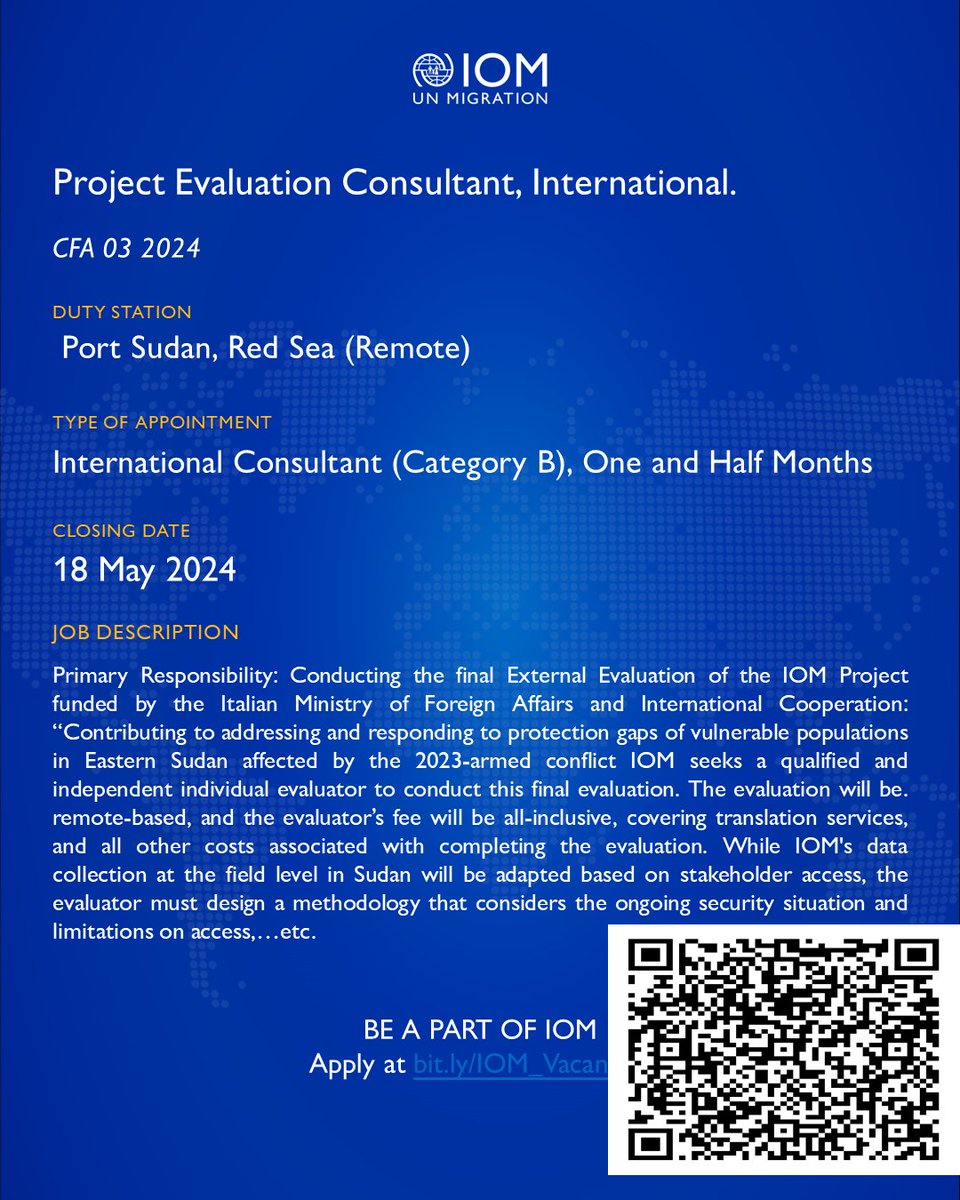 IOM is looking for a Project Evaluation Consultant, in Port Sudan, Red Sea (Remote).