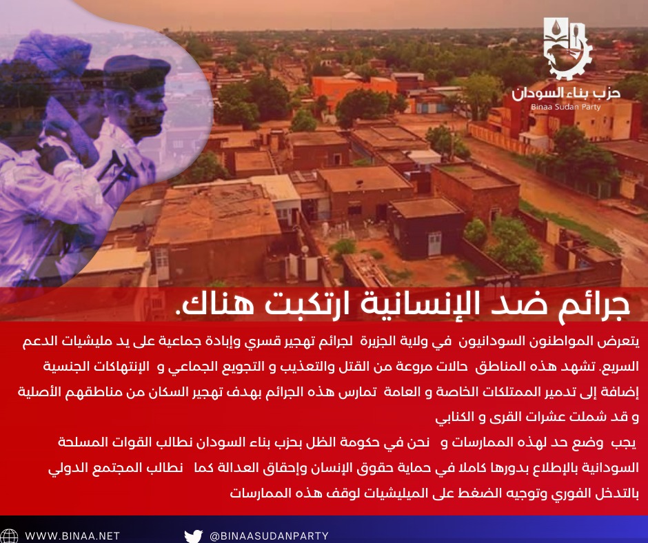 حزب بناء السودان جرائم ضد الإنسانية ارتكبت هنا! يتعرض المواطنون السودانيون في ولاية الجزيرة لجرا… By null Published September 18, 2025 Share SHARE Facebook Twitter Pinterest LinkedIn[ad_1] جرائم ضد الإنسانية ارتكبت هنا! يتعرض المواطنون السودانيون في ولاية الجزيرة لجرائم تهجير قسري وإبادة جماعية على يد مليشيات الدعم السريع. [ad_2] Source by حزب بناء السودان Facebook Twitter Pinterest LinkedIn Share This Article Facebook Twitter Email Print Previous Article وجدي صالح : لن نشارك في اي سلطة بخلاف سلطة الشعب ولن نشرعن الإنقلاب بل نعمل مع ب… Next Article |صور| صلاة عيد الفطر المبارك بمدينة #النهود #العيد_في_السودان_سلام … Leave a Comment Leave a Reply Cancel replyYour email address will not be published. Required fields are marked *Comment * Name * Email * Website Save my name, email, and website in this browser for the next time I comment. Δ SearchSearchRecent Postsأكرمنا الله صباح اليوم الأحد بلقاء إخوةٍ كرام، على ضفة النيل الأزرق، حيث شاي الش… أعلن بنك السودان المركزي في منشور إدارة السياسات رقم (2025/15) رفع الاحتكار عن ا… ندوة بعنوان: القانون الدولي والسيادة الوطنية قراءة في موقف السودان من لجنة تقصي … والي نهر النيل تستقبل وزير الموارد البشرية والرعاية الاجتماعية الوزير يشيد بالأ… كامل ادريس: رئيس اللجنة السياسية لمؤسسات الدولة السودانية. Recent CommentsNo comments to show.