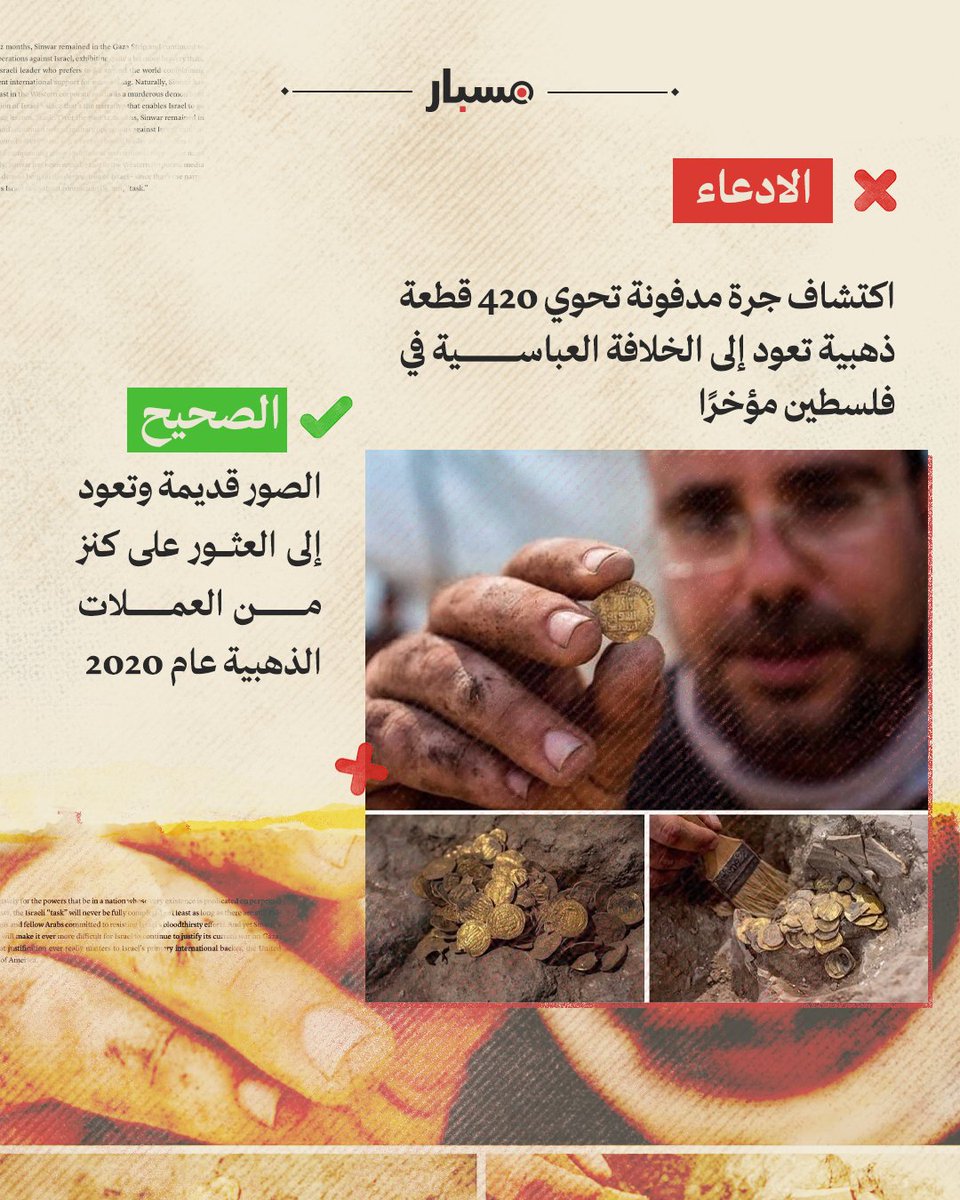 🔵 تعود الصور إلى أغسطس 2020، حين أعلنت سلطة الآثار الإسرائيلية اكتشاف كنز أثري نادر يضم عملات ذهبية من العصر العباسي يعود تاريخها إلى نحو 1100 عام.