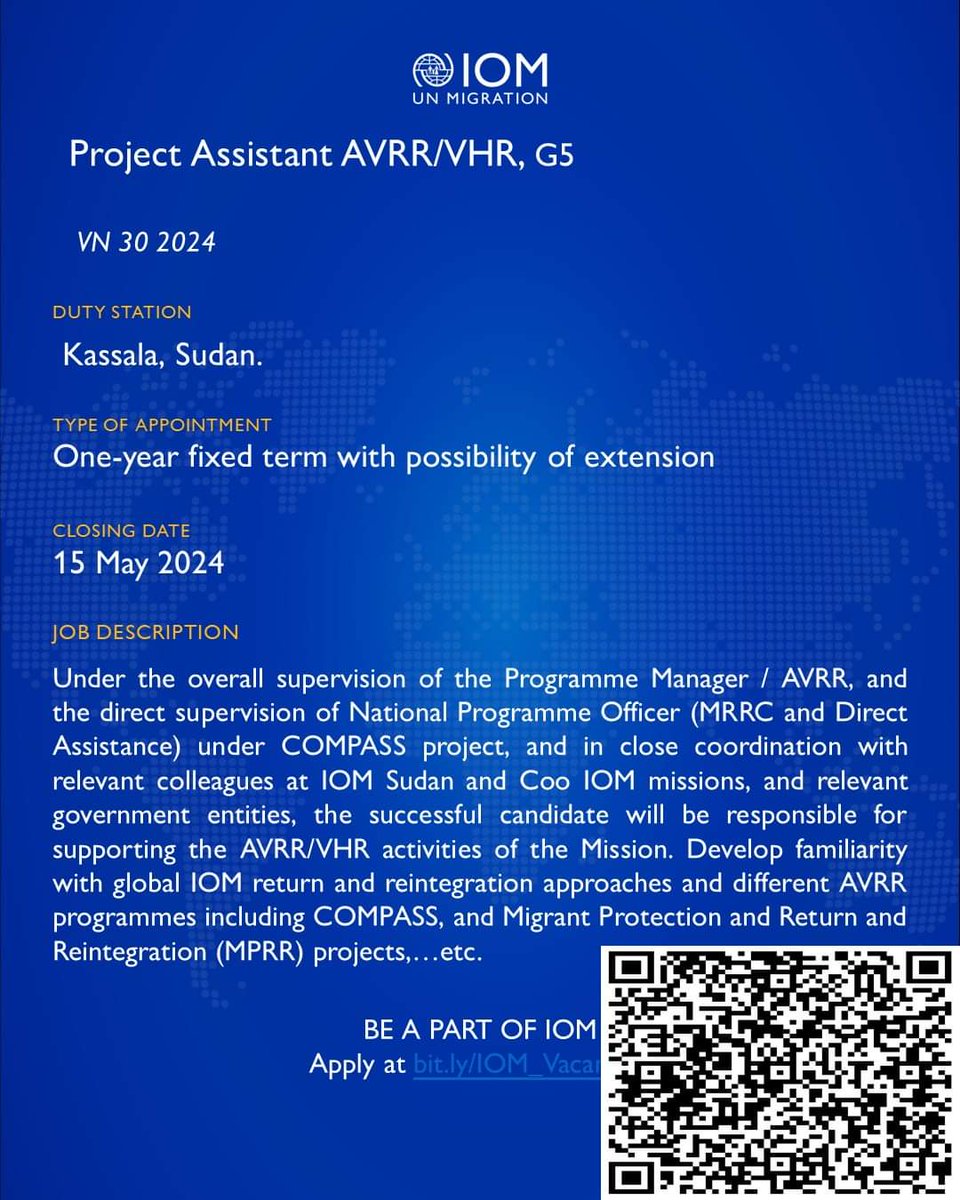 IOM is looking for a Project Assistant AVRR/VHR, G5, in Kassala, Sudan.