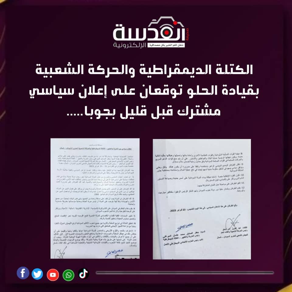 التوقيع بين الحرية والتغيير – الكتلة الديمقراطية والحركة الشعبية لتحرير السودان / شمال ، علي الإعلان السياسي اليوم بجوبا ، إنها خطوة هامة في اتجاه لتوحيد الرؤي الوطنية التي من شأنها تحدد وحدة ابناء الوطن طوعاً علي اساس المواطنة المتساوية .