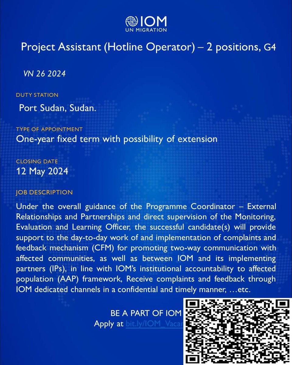 IOM is looking for a Project Assistant (Hotline Operator) – 2 positions, G4, in Port Sudan, Sudan.