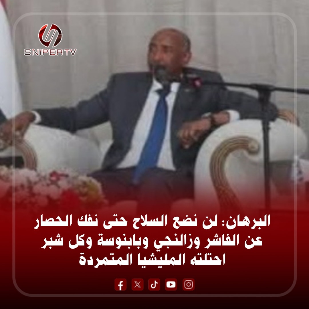 نادر البدوي البرهان: لن نضع السلاح حتى نفك الحصار عن الفاشر وزالنجي وبابنوسة وكل شبر احتلته … By null Published September 18, 2025 Share SHARE Facebook Twitter Pinterest LinkedIn[ad_1] البرهان: لن نضع السلاح حتى نفك الحصار عن الفاشر وزالنجي وبابنوسة وكل شبر احتلته المليشيا المتمردة [ad_2] Source Facebook Twitter Pinterest LinkedIn Share This Article Facebook Twitter Email Print Previous Article لماذا أدافع عن رمزية السُلطة المدنية؟ ليس لدي أي تواصل مباشر أو غير مباشر مع رئي… Next Article فيديو يوثق العثور على حبل مشنقة داخل أحد المساجد في منطقة جبرة جنوب الخرطوم، وه… Leave a Comment Leave a Reply Cancel replyYour email address will not be published. Required fields are marked *Comment * Name * Email * Website Save my name, email, and website in this browser for the next time I comment. Δ SearchSearchRecent Postsأكرمنا الله صباح اليوم الأحد بلقاء إخوةٍ كرام، على ضفة النيل الأزرق، حيث شاي الش… أعلن بنك السودان المركزي في منشور إدارة السياسات رقم (2025/15) رفع الاحتكار عن ا… ندوة بعنوان: القانون الدولي والسيادة الوطنية قراءة في موقف السودان من لجنة تقصي … والي نهر النيل تستقبل وزير الموارد البشرية والرعاية الاجتماعية الوزير يشيد بالأ… كامل ادريس: رئيس اللجنة السياسية لمؤسسات الدولة السودانية. Recent CommentsNo comments to show.
