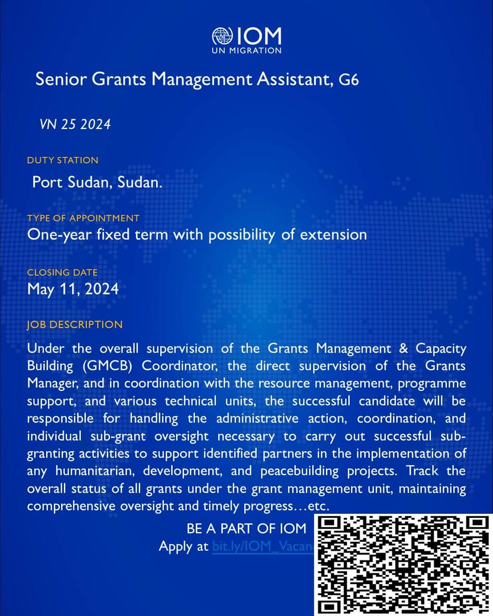 IOM is looking for a Senior Grants Management Assistant, G6, in Port Sudan, Sudan.