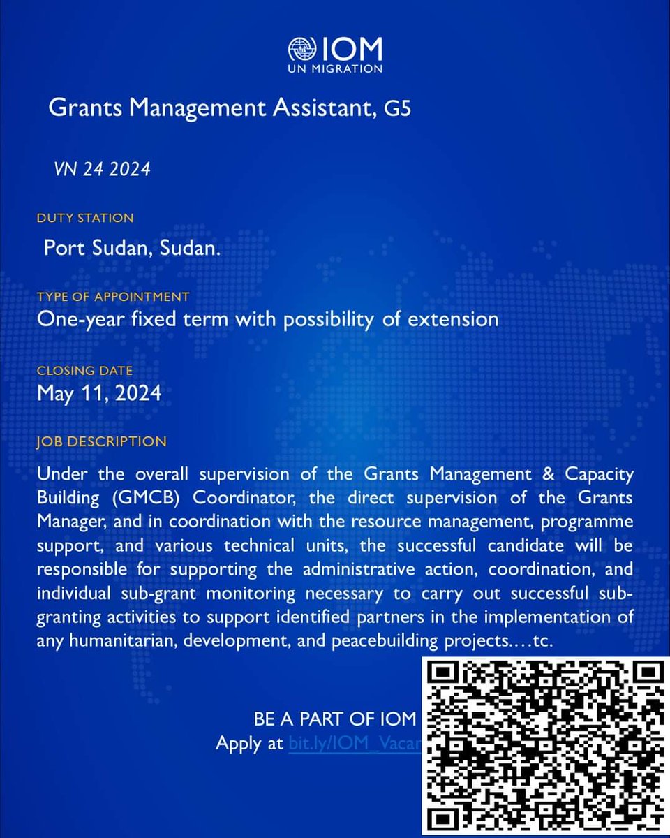 IOM is looking for a Grants Management Assistant, G5, in Port Sudan, Sudan.