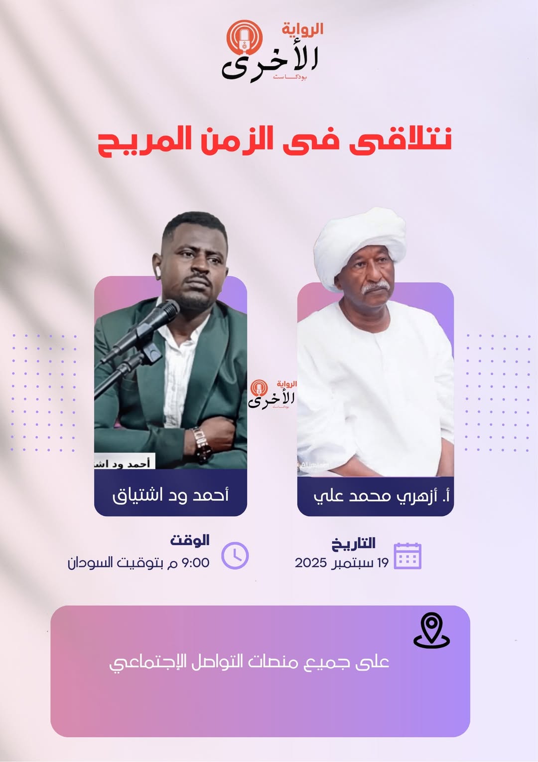 غدًا الجمعة – التاسعة مساءً بتوقيت السودان، نلتقي مع الشاعر الكبير أزهري محمد علي، في رحلة بين القصيدة والوطن… بين الذاكرة والحنين… بين الحلم واليقين.