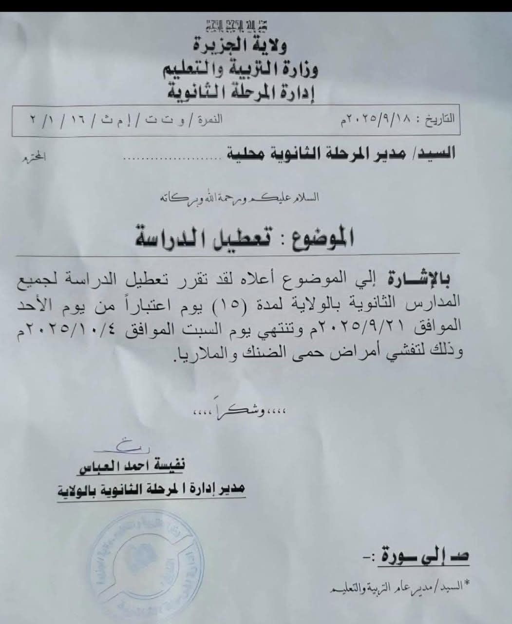 رصد السودان تعطيل الدراسه بولاية #الجزيرة بسبب تفشي أمراض حمي الضنك والملاريا. #شبكة_رصد_الس… By null Published September 19, 2025 Share SHARE Facebook Twitter Pinterest LinkedIn[ad_1] تعطيل الدراسه بولاية #الجزيرة بسبب تفشي أمراض حمي الضنك والملاريا. #شبكة_رصد_السودان [ad_2] Source Facebook Twitter Pinterest LinkedIn Share This Article Facebook Twitter Email Print Previous Article حيث اطلعت علي مجمل الأوضاع بولاية جنوب كردفان وفي مقدمتها الاوضاع الانسانية، وال… Next Article عقار والرئيس الرواندي يبحثان العلاقات الثنائية وتطورات الأوضاع بالسودان والإقلي… Leave a Comment Leave a Reply Cancel replyYour email address will not be published. Required fields are marked *Comment * Name * Email * Website Save my name, email, and website in this browser for the next time I comment. Δ SearchSearchRecent Postsأكرمنا الله صباح اليوم الأحد بلقاء إخوةٍ كرام، على ضفة النيل الأزرق، حيث شاي الش… أعلن بنك السودان المركزي في منشور إدارة السياسات رقم (2025/15) رفع الاحتكار عن ا… ندوة بعنوان: القانون الدولي والسيادة الوطنية قراءة في موقف السودان من لجنة تقصي … والي نهر النيل تستقبل وزير الموارد البشرية والرعاية الاجتماعية الوزير يشيد بالأ… كامل ادريس: رئيس اللجنة السياسية لمؤسسات الدولة السودانية. Recent CommentsNo comments to show.