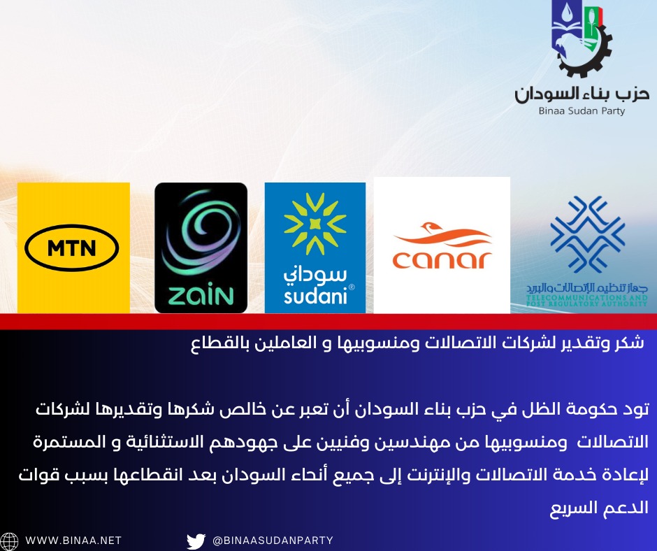 تود حكومة الظل في حزب بناء السودان أن تعبر عن خالص شكرها وتقديرها لشركات الاتصالات ومنسوبيها من مهندسين وفنيين على جهودهم الاستثنائية و المستمرة لإعادة خدمة الاتصالات والإنترنت إلى جميع أنحاء السودان بعد انقطاعها بسبب قوات الدعم السريع
