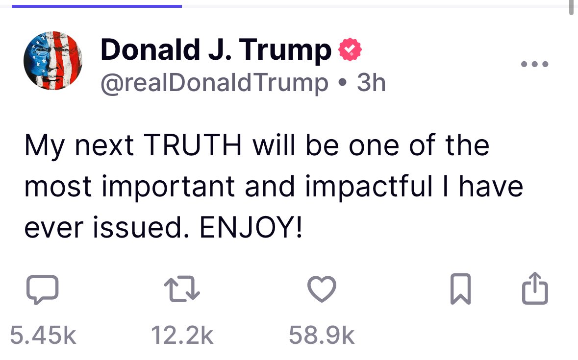 الرجل فنان في التعامل مع الاعلام واستقطاب الأخبار… منشور له منذ ٣ ساعات تقريبا” يعد فيه بأهم الإعلانات وأكثرها تاثيراً … والعالم يحبس انفاسه وينتظر… #ترمب