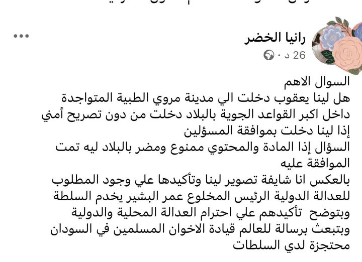 “يبدو أن المدعوة رانيا الحضرانة، كلما استحضرت مشاكلها القديمة مع جهاز النظام العام السوداني، صبّت جل غضبها على الإسلاميين في السودان.”