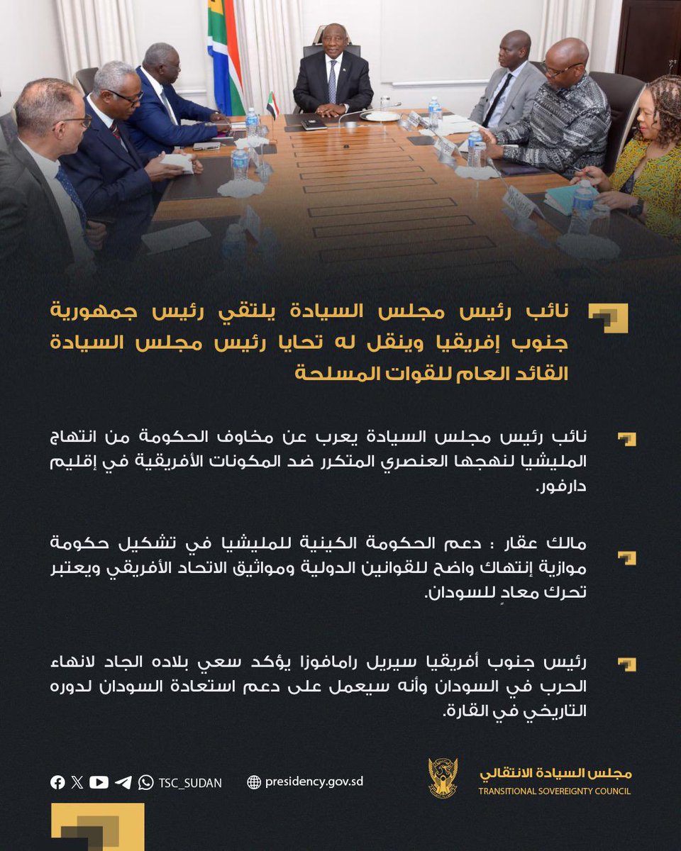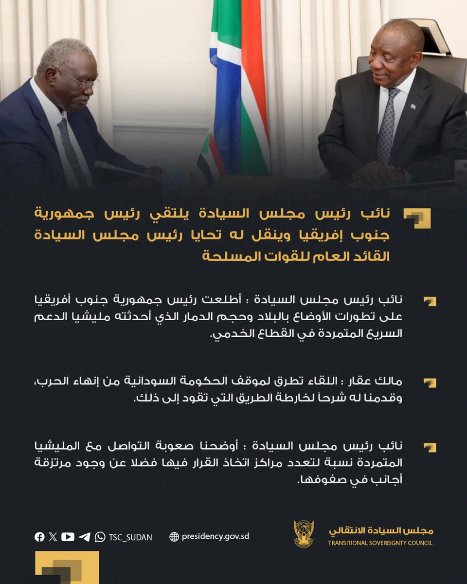 مجلس السيادة نائب رئيس مجلس السيادة يلتقي رئيس جمهورية جنوب إفريقيا كيب تاون ١٨-٣-٢٠٢٥م … By null Published September 19, 2025 Share SHARE Facebook Twitter Pinterest LinkedIn[ad_1] ⭕️ نائب رئيس مجلس السيادة يلتقي رئيس جمهورية جنوب إفريقيا كيب تاون ١٨-٣-٢٠٢٥م [ad_2] Source by مجلس السيادة الإنتقالي – السودان Facebook Twitter Pinterest LinkedIn Share This Article Facebook Twitter Email Print Previous Article The second point is that the fighting now is not between the Sudanese army and t… Next Article بعد نصف ساعة . تحليل لقاء عبدالرحيم دقلو ، تغريدة مناوي . … Leave a Comment Leave a Reply Cancel replyYour email address will not be published. Required fields are marked *Comment * Name * Email * Website Save my name, email, and website in this browser for the next time I comment. Δ SearchSearchRecent Postsأكرمنا الله صباح اليوم الأحد بلقاء إخوةٍ كرام، على ضفة النيل الأزرق، حيث شاي الش… أعلن بنك السودان المركزي في منشور إدارة السياسات رقم (2025/15) رفع الاحتكار عن ا… ندوة بعنوان: القانون الدولي والسيادة الوطنية قراءة في موقف السودان من لجنة تقصي … والي نهر النيل تستقبل وزير الموارد البشرية والرعاية الاجتماعية الوزير يشيد بالأ… كامل ادريس: رئيس اللجنة السياسية لمؤسسات الدولة السودانية. Recent CommentsNo comments to show.