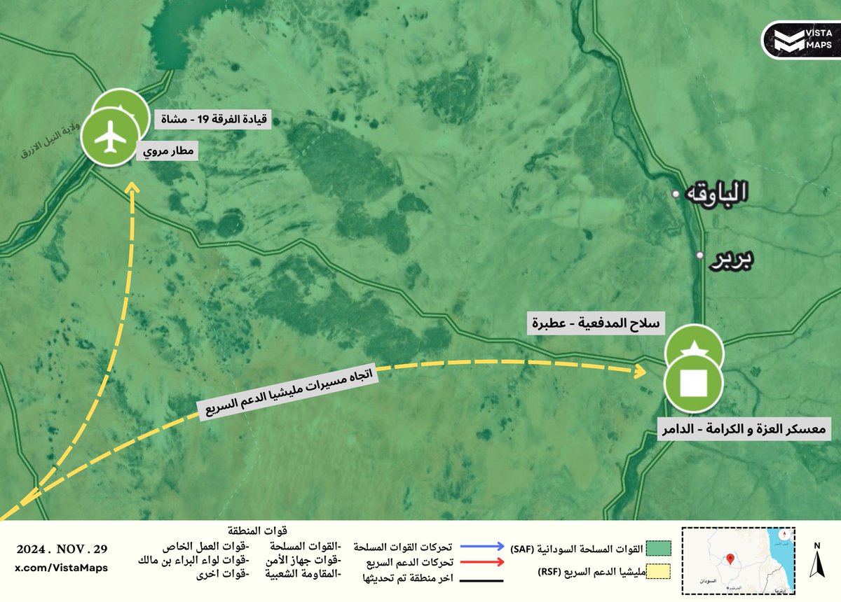 – منذ بداية نوفمبر كثفت مليشيا الدعم السريع هجماتها على عطبرة بالمسيرات الانتحارية ثم توجهت نحو مروي صباح اليوم مستهدفةً المطار والفرقة 19 مشاة.