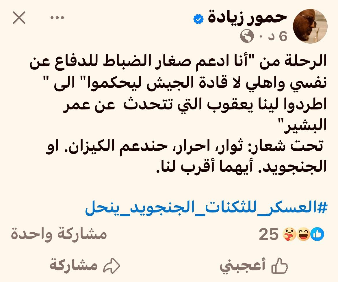 من ينكر ان هذه حرب الكيزان هم من اشعلوها وهم من يقودونها ومن مصلحتهم استمرارها وان القضية لا وطن ولا مواطن ولا جيش واحد من اتنين :