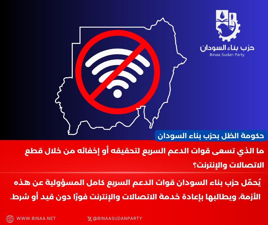 يتابع حزب بناء السودان بقلق بالغ تدهور الأوضاع في السودان، وآخرها قيام قوات الدعم السريع بقطع خدمة الاتصالات والإنترنت في البلاد.