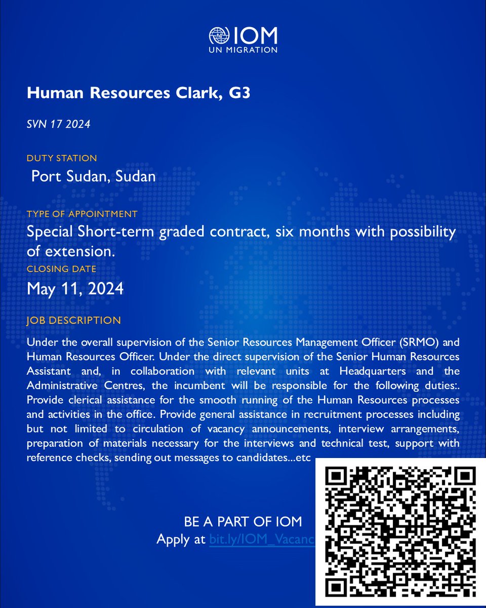 IOM is looking for a Human Resources Clark G3, in Port Sudan., Sudan.