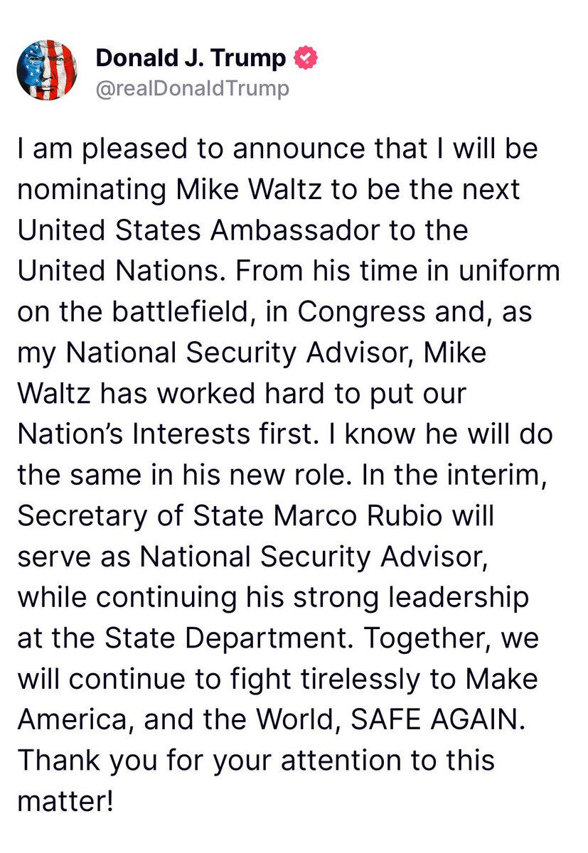 🚨#ترمب يعلن ان وزير خارجيته سيكون مؤقتا” مستشاره للأمن القومي خلفا” لمايك والتز، ويعين والتز في منصب مندوب في الأمم المتحدة . (يحتاج لمصادقة مجلس الشيوخ).