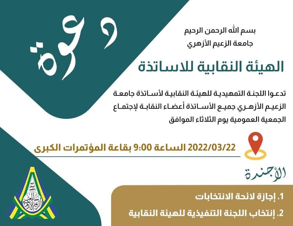 تهنئ اللجنة التمهيدية للهيئة النقابية لاساتذة جامعة الزعيم الازهري أعضاء الجمعية العمومية بانجازهم لنظامهم الاساسي وتدعوهم لحضور الجمعية العمومية التي سوف تعقد يوم الثلاثاء ٢٢-٣-٢٠٢٢ بقاعة المؤتمرات