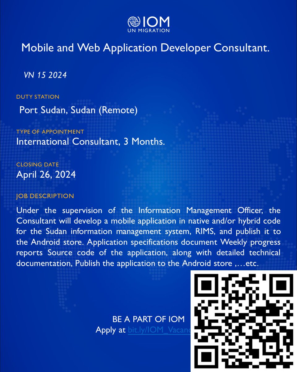 IOM is looking for a Mobile and Web Application Developer Consultant, in Port Sudan., Sudan (Remote).